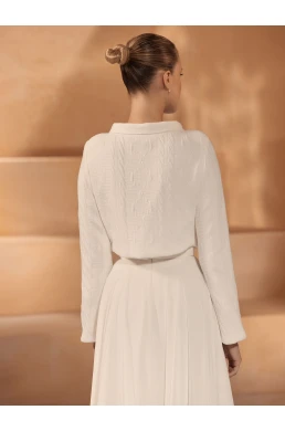 Tento pletený svatební svetr s dlouhými rukávy je ideální volbou pro podzimní nevěsty, které chtějí zůstat v teple a zároveň elegantní. Model E-431 má praktické zapínání vpředu a klasický kulatý výstřih, což z něj činí nadčasový a pohodlný doplněk k svatebním šatům.