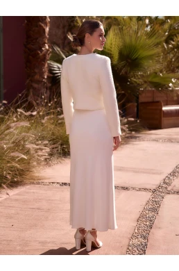 Tato pletená svatební bunda s plnými rukávy je elegantním a praktickým doplňkem pro zimní svatbu. Model E-494 má klasický něžný kulatý výstřih a zapínání na cvočky, které je zdobené dekorativními knoflíčky. Luxusní svatební úplet dodává bundě sofistikovaný charakter, zatímco pohodlný střih zajistí příjemné nošení i během chladnějších dní.