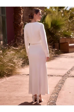 Toto elegantní svatební sako E-498 s dlouhými rukávy je vyrobeno z vysoce kvalitního strečového krepu, který zaručuje dokonalé přizpůsobení a pohodlí. Otevřený výstřih dodává modelu moderní a ženský charakter, díky čemuž je ideální volbou pro občanskou svatbu nebo elegantní svatební outfit. Díky svému minimalistickému designu se snadno kombinuje s různými svatebními šaty nebo topy a působí stylově i nadčasově.