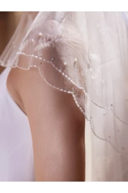 Představujeme vám okouzlující dvouvrstvý svatební závoj vyrobený z nejjemnějšího měkkého tylu, který zaručuje eleganci a nadčasový vzhled. Model S-523 má délku 80 cm a doplňkovou 60 cm lícenkovou vrstvu, která dodává závoji větší objem a romantický efekt. Jemný korálkový okraj je zdoben 59 perlami a 60 křišťálovými korálky, které podtrhují jeho luxusní charakter a půvab. Závoj se dodává s předpřipraveným hřebenem, který zajišťuje pohodlné a bezpečné nošení.