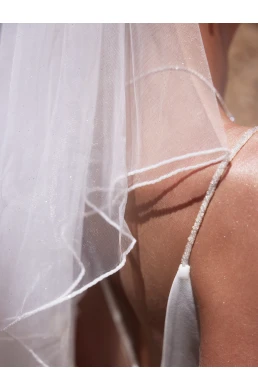 Tento úžasný dvouvrstvý svatební závoj je elegantním doplňkem, který dodá svatebním šatům jemný lesk a působivý objem. Model S-494 je vyroben ze třpytivého tylu a má délku 80 cm s dodatečnou 60 cm tvářenkou. Okraje závoje jsou zdobeny jemnými skleněnými korálky, které mu dodávají luxusní a sofistikovaný charakter. Závoj se dodává s připevněným hřebenem, který zajišťuje pohodlné a bezpečné nošení.
