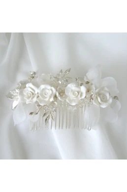 Mit größter Sorgfalt gefertigt, verfügt dieser Haarkamm über zarte weiße Blüten und Stoffblättchen, die eine fesselnde Komposition bilden. Das filigrane Design wird sorgfältig von Hand gefertigt, wobei jedes Blütenblatt perfekt in den Kamm eingesetzt wird, um eine atemberaubende visuelle Wirkung zu erzielen.
