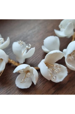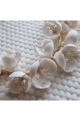 Goldfarbe verleiht dem Accessoire einen Hauch von Luxus und Eleganz, während die weiße Porzellanblume eine Note von Natur und Zärtlichkeit hinzufügt. Das Accessoire ist auf einem Haarkamm befestigt. Dieses Design ermöglicht der Braut eine einfache und bequeme Platzierung des Accessoires im Haar.