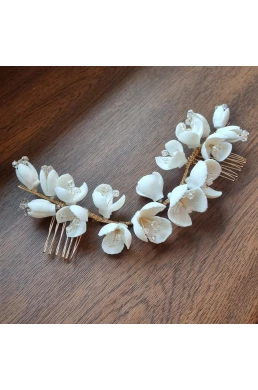 Stilvolle Hochzeitsdekoration für das Haar. Porzellanblumen sind von Hand an zwei Haarkämmen mit goldfarbenen Drähten befestigt. Es sieht wunderschön aus, sowohl in halboffenem, lockerem Haar als auch in einer hochgesteckten, voluminösen Frisur.