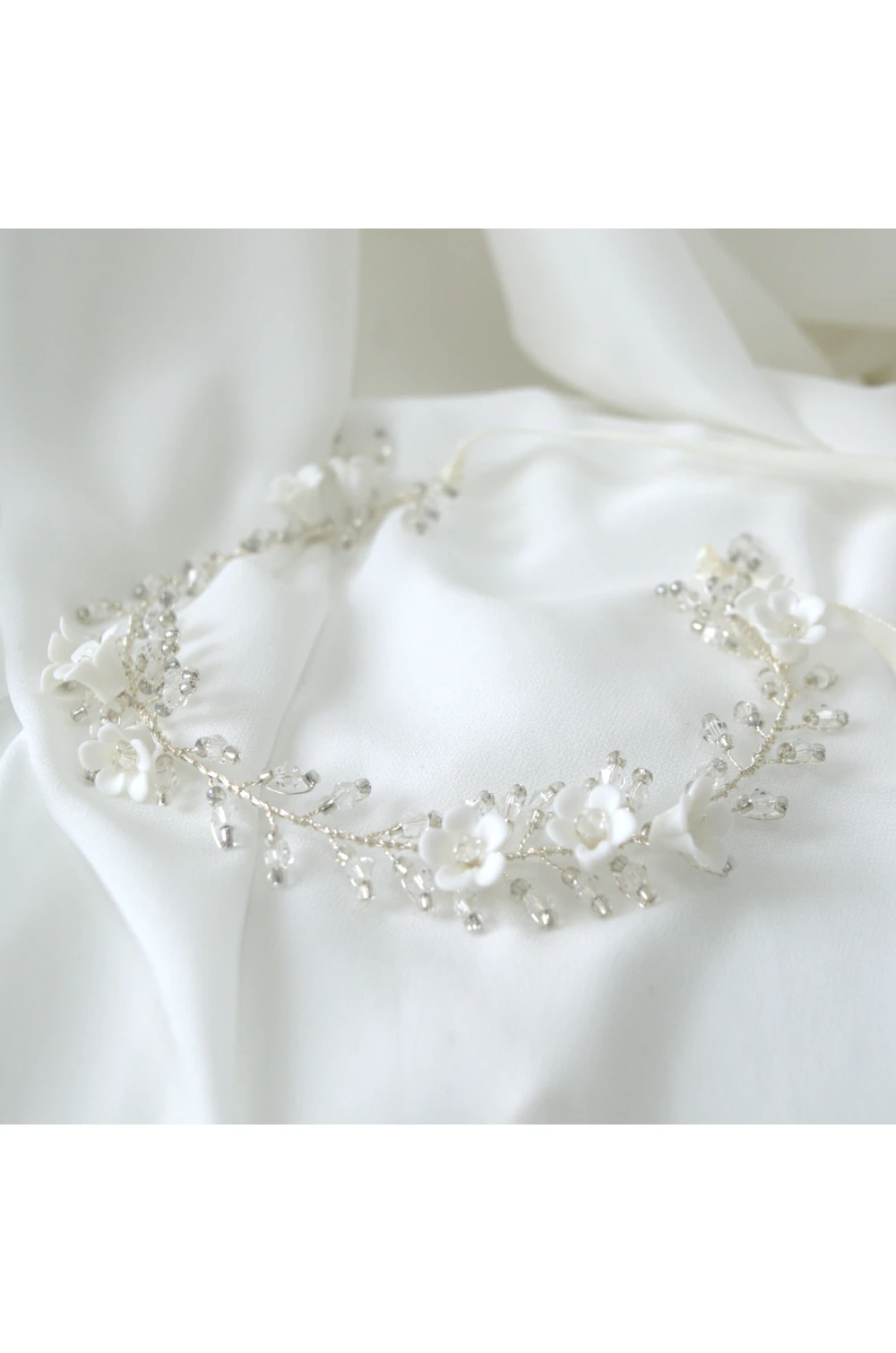 Silberne Girlande oder Kleidergürtel mit Porzellanblumen. Sie können sie mithilfe von Schleifen oder Spangen in die Haare befestigen, und die Schleifen lassen sich leicht wieder herausnehmen.