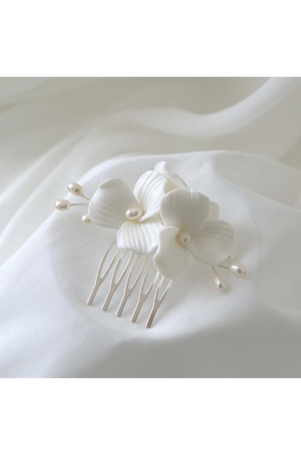 "PORZELLANKAMM" von EvaMária ist ein frischer und eleganter Haarschmuck, der für Bräute bestimmt ist. Dieses außergewöhnliche Hochzeitszubehör ist aus hochwertigem Porzellan gefertigt, das sich hervorragend für verschiedene Frisurenarten eignet.