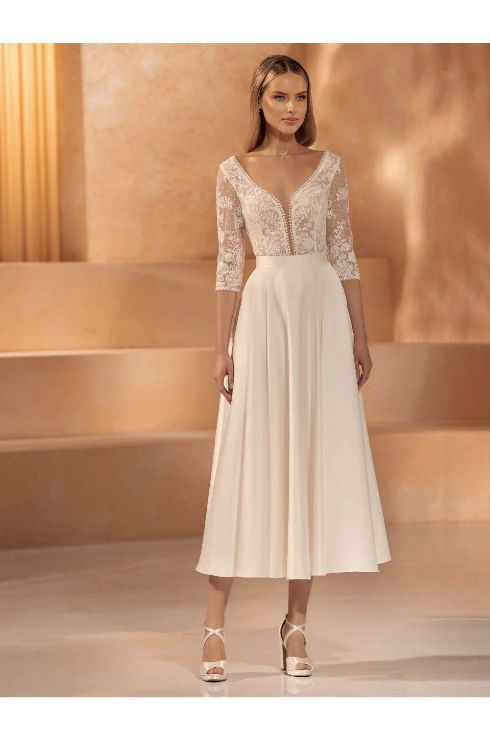 In der eleganten Elfenbeinfarbe harmoniert der ADA-Rock perfekt mit traditionellen Hochzeitsnuancen und wirkt zeitlos. Seine Schlichtheit wird mit modernen Elementen kombiniert, was ihn zu einem idealen Stück für Bräute macht, die auf einen klassischen Look nicht verzichten möchten, aber auch einen Hauch von Innovation in ihr Hochzeitsoutfit bringen möchten.