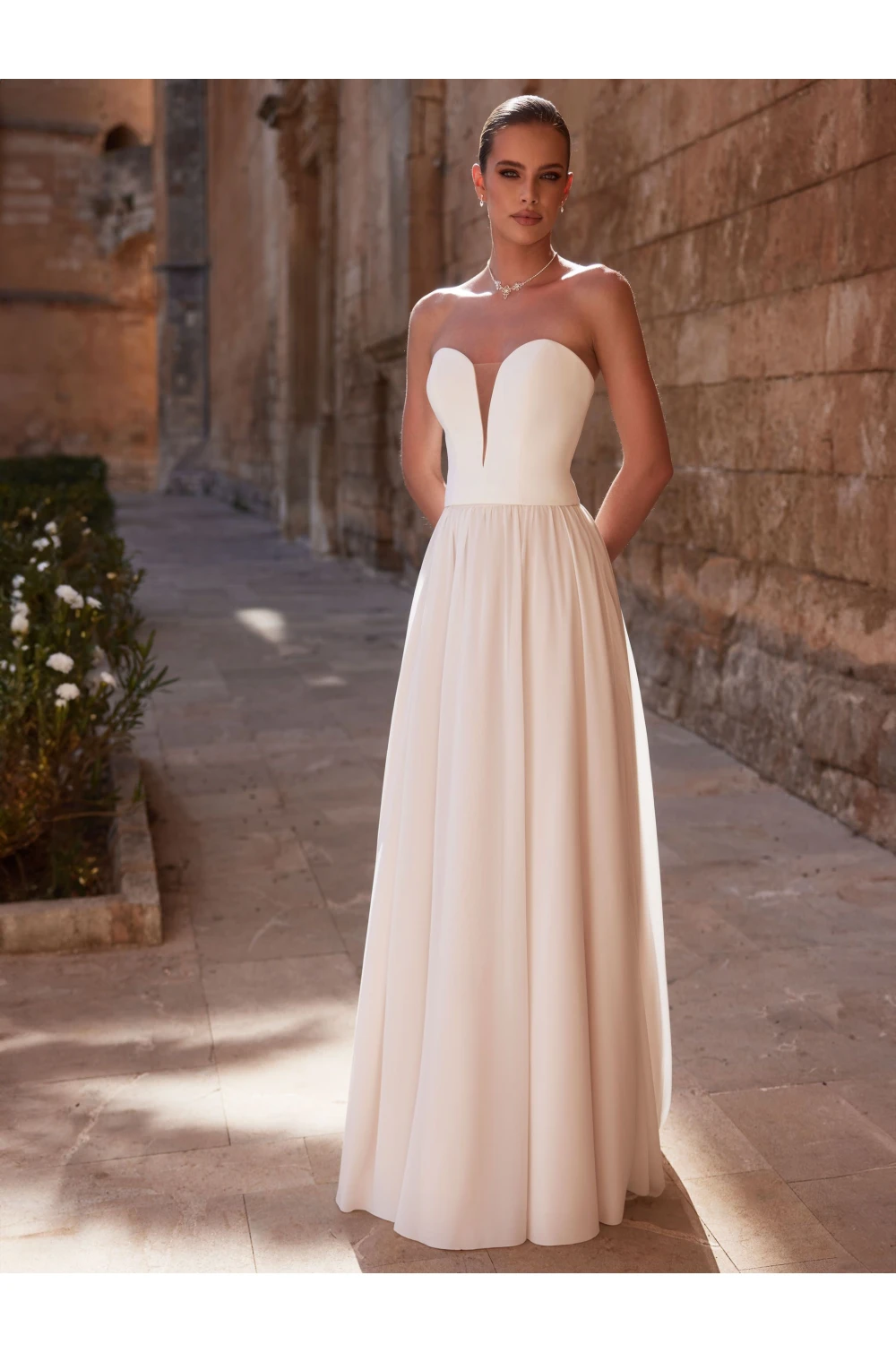 Der Hochzeitsrock MIRABELA ist ein elegantes Modell im A-Linien-Schnitt aus feinem Chiffon, das leicht und luftig wirkt. Der Rock ist in Champagnerfarbe gefüttert, was dem Outfit eine einzigartige und stilvolle Note verleiht. Er hat eine natürliche Taille, die die Figur schön betont, und eine breite Schleppe, die dem Look eine romantische und majestätische Note verleiht. Dieses Modell ist die ideale Wahl für Bräute, die Eleganz und Tragekomfort suchen.