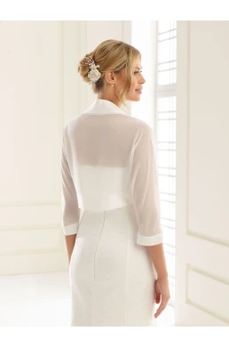 Der zarte Brauttop E-92 ist aus Chiffon und mattem Satin gefertigt, was ihm Leichtigkeit und zeitlose Eleganz verleiht. Dank seines universellen Designs eignet er sich für jeden Anlass – vom Hochzeitstag bis zu gesellschaftlichen Anlässen. Der Brauttop besitzt 3/4-Ärmel und ist mit einem Satinrand versehen, der sein anspruchsvolles Erscheinungsbild betont. Dieses Modell ist eine ideale Ergänzung für Bräute, die nach einem sanften, aber markanten Detail zu ihrem Outfit suchen.