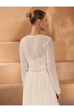 Der Pullover E-433 besticht durch lange Ärmel und einen offenen Ausschnitt, was ihn zu einem idealen Stück zum Layering macht. Seine gestrickte Textur verleiht dem Gesamtbild Tiefe und Struktur und schafft so einen einzigartigen stilvollen Effekt. Das hochwertige Garn, aus dem er gefertigt ist, ist nicht nur angenehm auf der Haut, sondern auch langlebig, was sicherstellt, dass der Pullover sein Aussehen auch nach vielen Tragesessions behält. Dieses Modell ist so gestaltet, dass es sich leicht mit verschiedenen Brautkleidern kombinieren lässt und so die Gesamtatmosphäre Ihres großen Tages verstärkt.