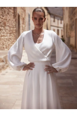 Dieser elegante Brautpullover ist aus Strickware mit luxuriösem Kaschmireffekt gefertigt, der sanft und zeitlos wirkt. Das Modell E-476 hat einen schmeichelhaften V-Ausschnitt und elegante lange Ärmel, die seinen romantischen Charakter betonen. Der Knopfverschluss vorne verleiht dem Pullover Praktikabilität und zugleich Stil. Durch seine Verarbeitung ist er das ideale Ergänzungsstück zu jedem Brautoutfit an kühleren Herbst- oder Wintertagen.