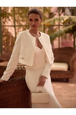 Der offene Ausschnitt verleiht der Jacke E-498 einen modernen und weiblichen Charakter, der jede Braut anspricht, die ihren großen Tag ohne Einschränkungen genießen möchte. Das minimale Design dieser Jacke ist ideal, um sie mit verschiedenen Brautkleidern und Oberteilen zu kombinieren, was sie zu einem flexiblen Kleidungsstück macht, das Sie auch nach der Hochzeit zu anderen besonderen Anlässen tragen können.