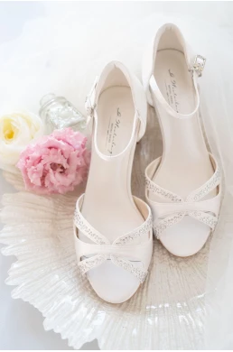 Außerordentlich bequeme Hochzeitschuhe. Die Gigi-Sandalen sind handgefertigte, exklusive Brautsandalen aus Satin in modernem und trendigem Stil. Die Vorderseite zieren hübsche Riemchen und funkelnde Kristalle. Ein modischer quadratischer Absatz sorgt für ganztägigen Komfort. Dank der Ledersohle, Gel-Einlage und gepolstertem Fersenbereich sind diese Sandalen nicht nur schön, sondern auch sehr bequem. Der verstellbare Riemen sorgt für zusätzliche Stabilität.