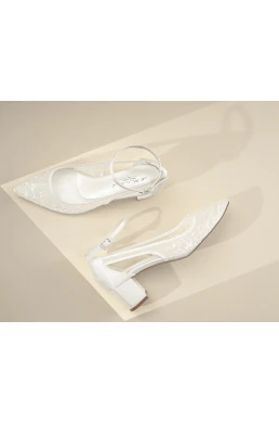 Daphne-Schuhe sind handgefertigte, exklusive Brautschuhe, verziert mit illusionärer Spitze. Es handelt sich um eine modifizierte Version des meistverkauften Modells Tamara, doch Daphne hat einen niedrigeren Absatz. Daphne-Hochzeitschuhe sind wirklich einzigartig dank eines speziellen durchsichtigen Tüllmaterials und einer blumigen Spitzenverzierung. Dank der Lederinnensohle und Gel-Füllung bieten sie einen optimalen und außergewöhnlich bequemen Tragekomfort. Ein verstellbarer Riemen sorgt für Stabilität, während der Blockabsatz maximalen Komfort für die Braut gewährleistet.