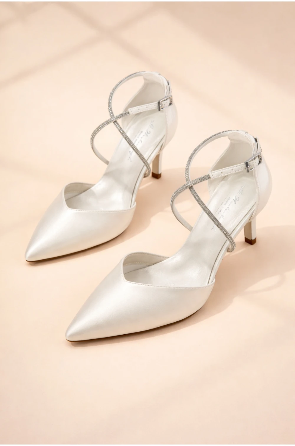 Die Brautschuhe Marielle sind elegante, handgefertigte Satinschuhe für Bräute, die luxuriös aussehen möchten und gleichzeitig den gesamten Hochzeitstag ohne Schuhwechsel bewältigen können. Ein klares, modernes Design in Elfenbein-Satin lässt sich leicht mit verschiedenen Stilen von Brautkleidern kombinieren. Der verstellbare, funkelnde Riemen kann auf zwei Arten getragen werden; im Lieferumfang enthalten ist auch ein Ersatz-Satinriemen, um das Erscheinungsbild einfach zu verändern. Ein stabiler Absatz mit einer Höhe von 7,8 cm verleiht Eleganz, ohne die Sicherheit beim Gehen zu beeinträchtigen. Eine weiche Gel-Einlegesohle, Leder- und gepolstertes Innenfutter sowie eine weiche Ferse sorgen auch bei ganztägigem Tragen für außergewöhnlichen Komfort.