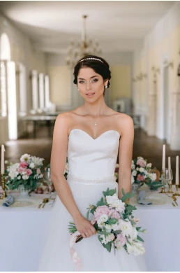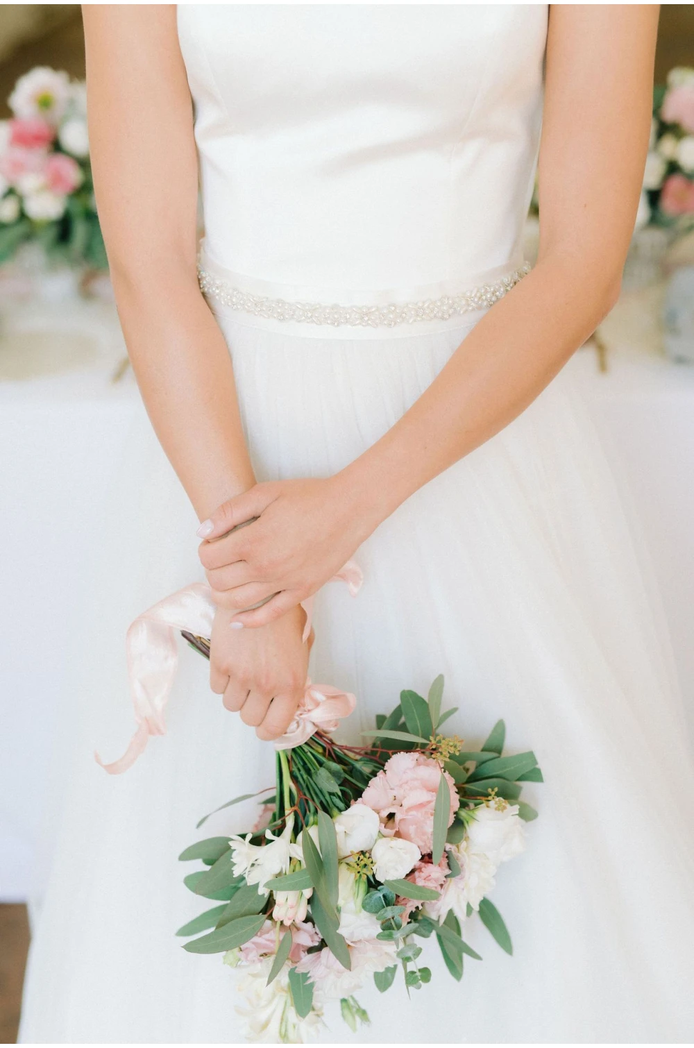 Schöner Brautgürtel BLT-1915 ist mit funkelnden Kristallen und zarten grauweißen Perlen verziert, die ihm ein klassisches und elegantes Aussehen verleihen. Dieses zeitlose Accessoire ist die perfekte Wahl zu jedem Brautkleid und verleiht ihm einen zarten Glanz sowie ein raffiniertes Detail. Die Maße des Gürtels betragen 46 cm x 1,8 cm, wodurch er dezent wirkt und zugleich stilvoll.