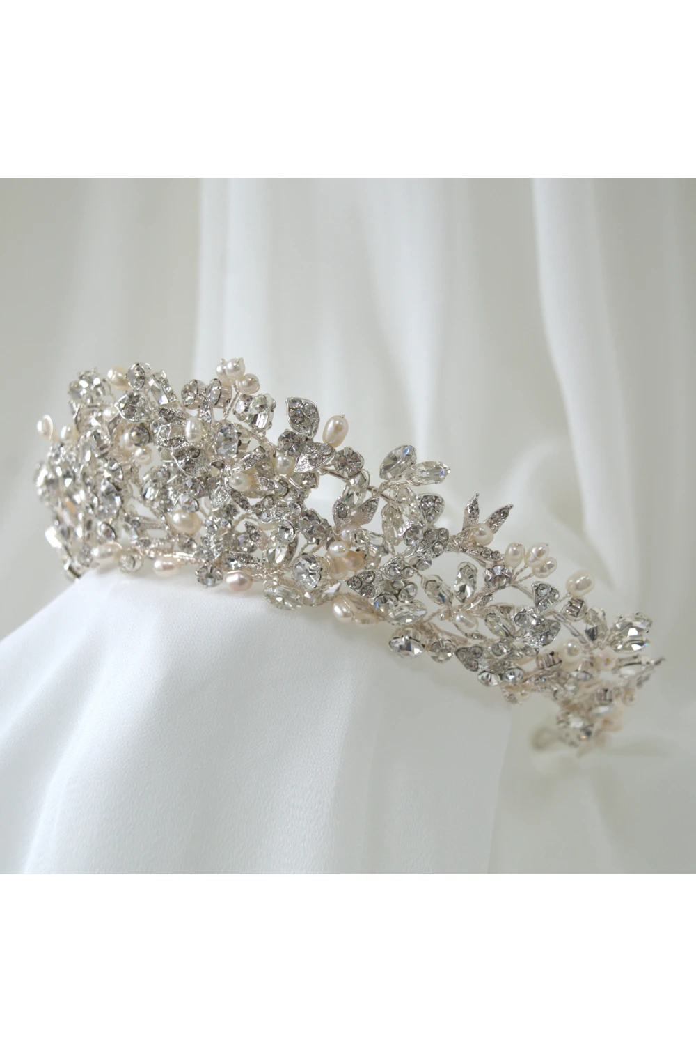 Wunderschöne handgefertigte luxuriöse hohe Hochzeitskrone für die Braut mit Steinen und Perlen.