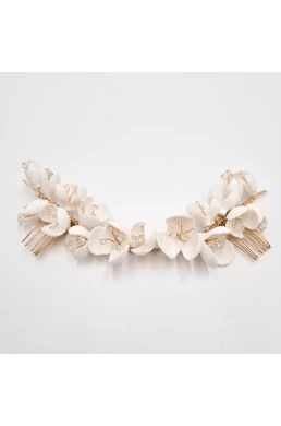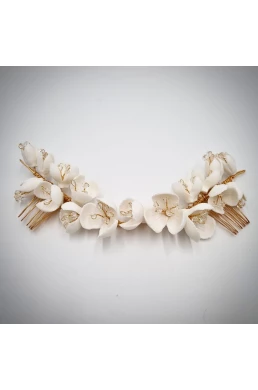 Wedding hair decoration in gold color with a comb and white porcelain flowers is a great addition for brides who are looking for an elegant and romantic style for their big day. This delicate and tasteful decoration is made from high-quality materials and is perfectly crafted to meet the highest demands of the bride.