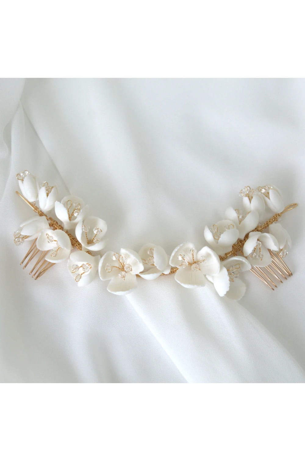 Stylish wedding hair decoration. Porcelain flowers are hand attached to 2 combs with golden wire. It looks beautiful in semi-loose hair as well as in an updo hairstyle.