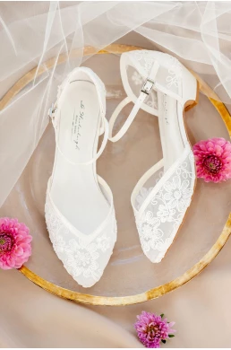 Maximally comfortable wedding shoes. The Estella wedding footwear was inspired by our bestseller in the style of Miriam. Specially handcrafted wedding shoes with a transparent lace cover. The Estella shoes are adorned with a romantic floral pattern on the front and back. Thanks to the low heel, they provide heavenly comfort all day long. The soft gel insole and leather lining provide truly comfortable wear. We also recommend the Estella wedding shoes for summer and garden weddings.