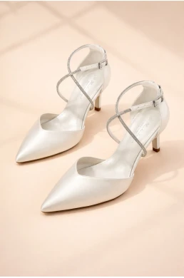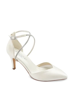 Marielle Wedding Shoes are elegant, handcrafted satin shoes for brides who want to look luxurious and be able to handle the entire wedding day without changing shoes. The clean, modern design in ivory satin easily complements various styles of wedding dresses. The adjustable sparkling strap can be worn in two ways, and the package also includes a spare satin strap for easy style change. The stable 7.8 cm heel provides elegance without compromising walking stability. The soft gel insole, leather and padded lining, along with a soft heel, ensure exceptional comfort even with all-day wear.