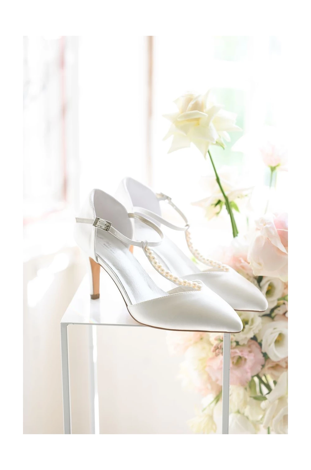 Maximally comfortable wedding shoes. Sienna shoes are exclusive wedding shoes adorned with freshwater pearls on the T-bar. This Sienna model is truly elegant. Soft gel insole, cushioned lining, and leather insole provide comfortable wear.