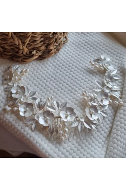 L'ornamento è realizzato in metallo di colore argento, conferisce un aspetto stiloso ed elegante. È dotato di un pettine che consente un fissaggio facile e confortevole sui capelli. Le perle che lo adornano aggiungono un'atmosfera sofisticata e di lusso. Con fiori di porcellana bianchi e foglie, l'ornamento è perfettamente completato, creando un aspetto romantico impeccabile.