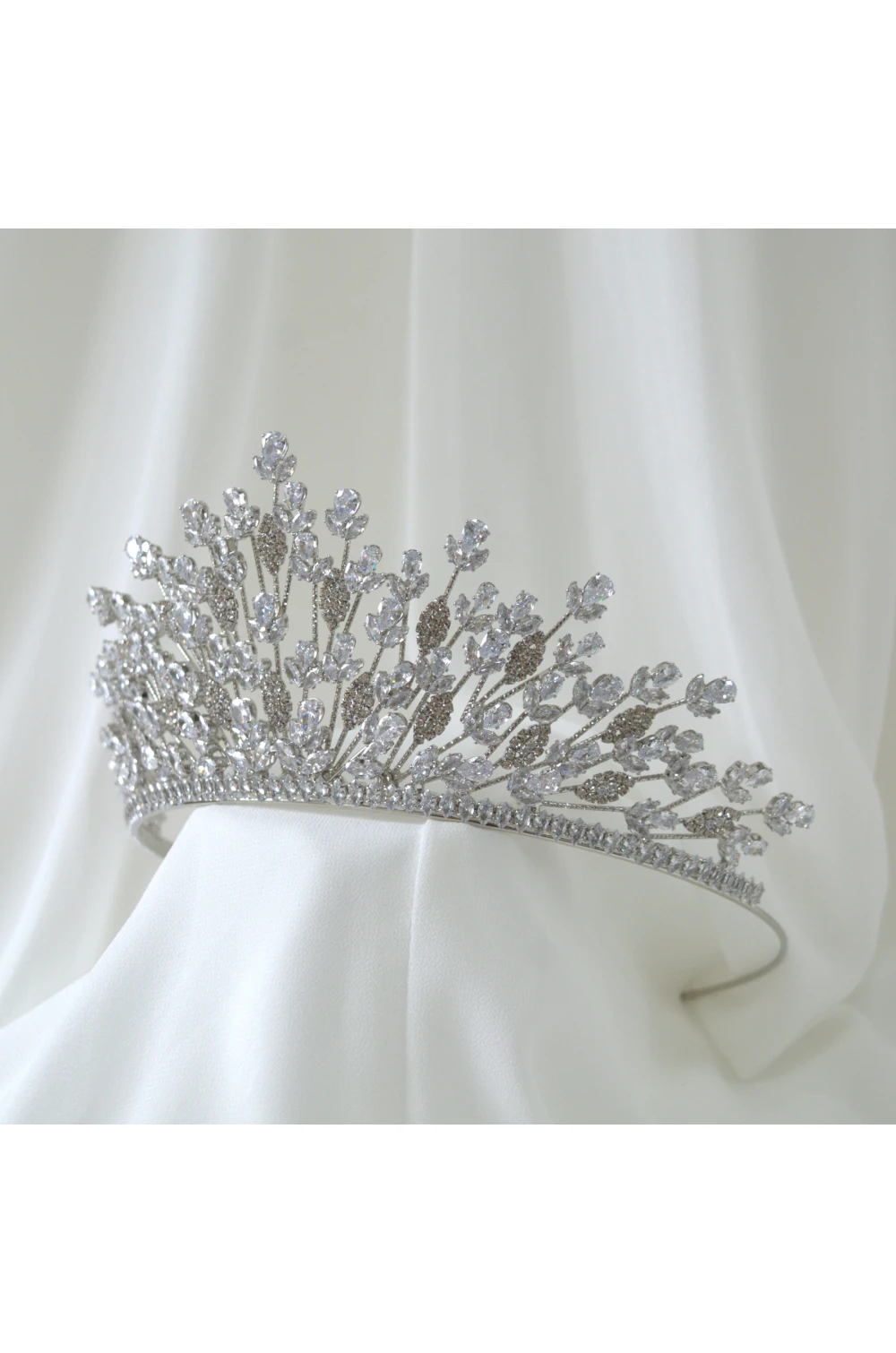 Corona da sposa rialzata di colore argento con pietre.