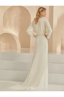 La gonna da sposa MAKIRA è tagliata in modo elegante e leggermente svasata, realizzata in chiffon di alta qualità, che appare ariosa e romantica. È dotata di una lunga coda e di una fodera morbida, che garantisce il massimo comfort per tutta la giornata. Questo splendido capo da sposa è ideale da abbinare a corsetti moderni e bolerini, ma può essere aggiunto anche a un abito riccamente decorato per creare un look da sposa indimenticabile.