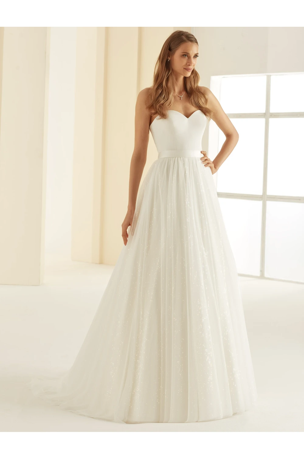 La gonna da sposa BUTTERFLY è un modello romantico e imponente, che incanta per la sua leggerezza e l'effetto luccicante. Lo strato superiore è realizzato in tulle lucido e sottile, mentre lo strato inferiore in tulle morbido conferisce alla gonna volume e leggerezza. Una cintura in raso cucita in vita ne mette in risalto la silhouette naturale e completa l'aspetto elegante. Questo modello trasparente è l'opzione ideale per le spose che desiderano dare al loro abito da sposa una nota romantica e moderna.