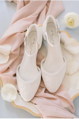 Scarpe da sposa basse estremamente comode. Le scarpe Lana sono realizzate a mano, esclusive scarpe da sposa in raso satinato dallo stile classico. Grazie all'altezza ridotta del tacco, questo stile garantisce comfort per tutte le spose. La bellissima copertura in pizzo si abbina a qualsiasi stile di abito da sposa. Grazie a una soletta in pelle, all'imbottitura in gel e a una fodera imbottita con retro imbottito, questo stile non è solo bello, ma anche molto comodo. La cinghia regolabile garantisce ulteriore stabilità.