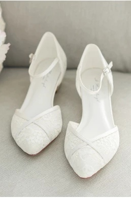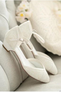 Scarpe da sposa estremamente comode. Le scarpe Mira sono fatte a mano, esclusive scarpe da sposa in raso satinato con una lucentezza speciale. Sotto la copertura in pizzo c'è un bellissimo materiale luccicante che rende questo modello una vera specialità. L'imbottitura morbida in gel, plantare in pelle e fodera in spugna assicurano una calzata comoda.