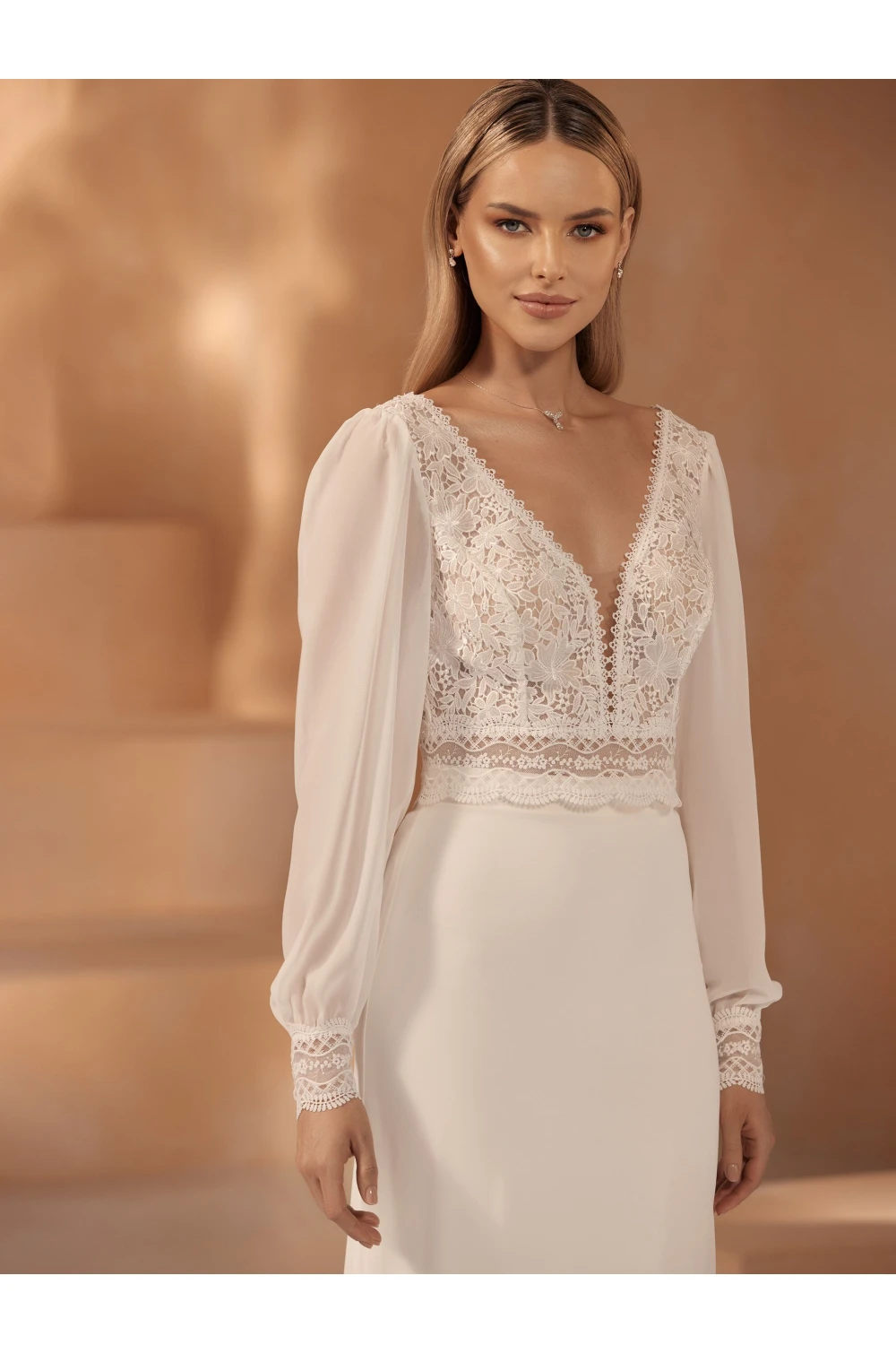 Questo elegante top da sposa E-425 è realizzato in pizzo fine e chiffon ed è una scelta ideale per le spose autunnali. Grazie alle maniche lunghe offre comfort anche nei giorni più freddi, mantenendo al contempo un aspetto romantico e femminile. Il top ha scollo a V e chiusura con bottoni sulla schiena, che conferisce all'outfit un dettaglio sofisticato. Abbinalo a un abito da sposa con schiena scoperta, a tacchi eleganti e a una fascia per capelli, per creare un look da sposa armonioso e incantevole.
