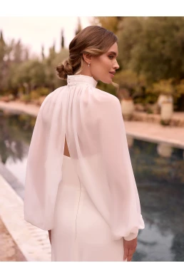 Il top da sposa E-491 è progettato ponendo l'accento su ogni dettaglio. Le maniche a mantellina aggiungono unicità e leggerezza, mentre l'elevato colletto crea una silhouette elegante che valorizza ogni tipo di figura. La chiusura con bottoni sul retro del collo e sui polsini delle maniche garantisce una perfetta vestibilità e comfort per tutta la giornata.