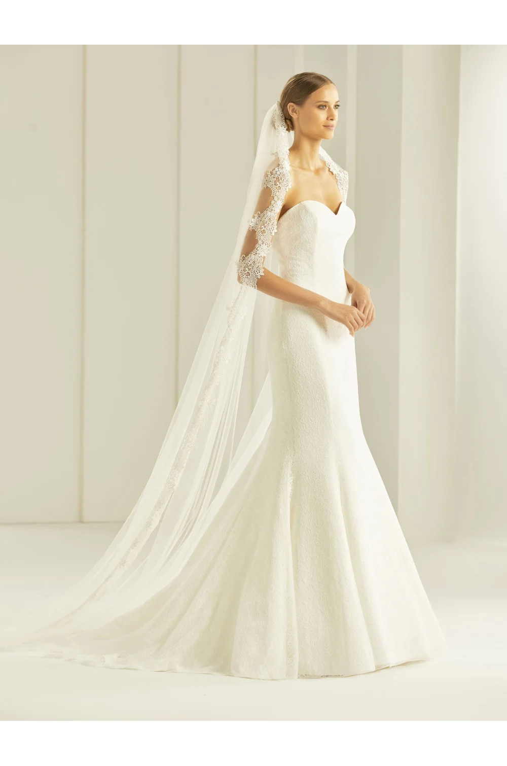 Il velo è realizzato in tulle morbido e delicato e ha una lunghezza di 300 cm, che corrisponde alla lunghezza a cattedrale. Viene fornito con un pettine già fissato, che garantisce un fissaggio semplice, rapido e sicuro all'acconciatura.