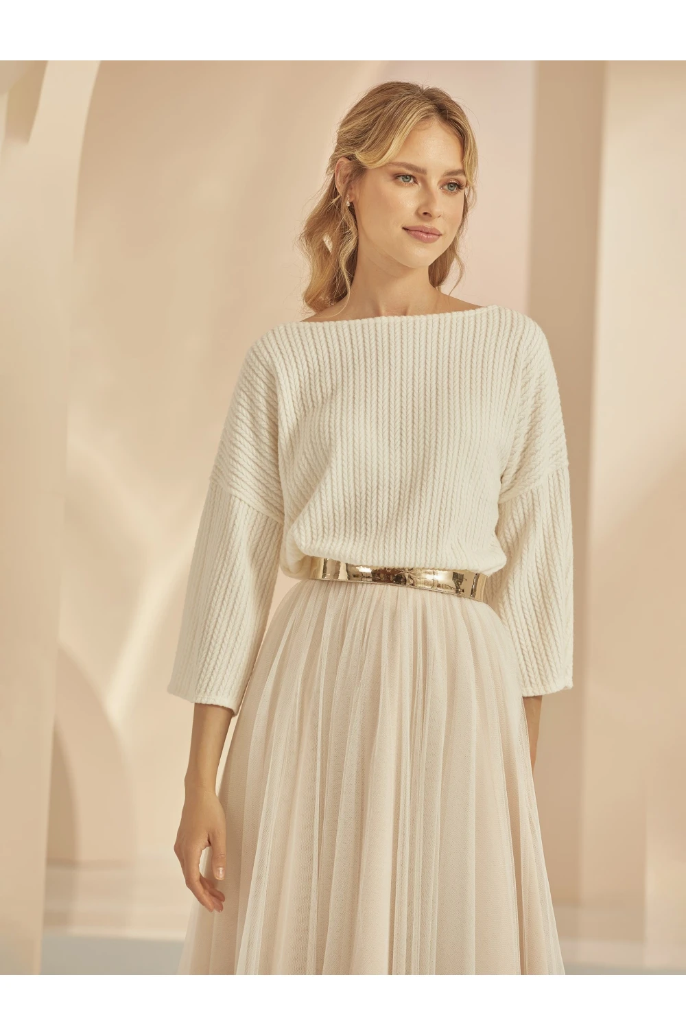 Naše svadobné svetre sú vyrobené z prémiových materiálov, čo zabezpečuje nielen ich pohodlné nosenie, ale aj dokonalý vzhľad počas celého dňa. Svetrík E-342 je prepracovaný do najmenších detailov, pričom jeho žiarivá a luxusná povrchová úprava dodáva celkovému vzhľadu nádych elegancie. S lodičkovým výstrihom a plnými rukávmi podčiarkuje jemnú ženskosť a vytvára harmonický kontrast s tradičným svadobným šatám.