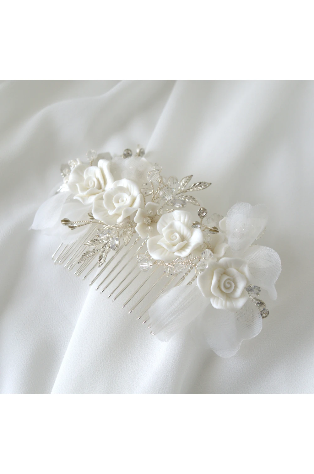 Precízna ručná výroba. Ku kovovému hrebienku sú ručne drôtikmi prichytené porcelánové kvietky vo farbe ivory, kovové lístky a korálky. Pôvabnosť hrebienku dávajú ručne vyrobené lístky z organzy.