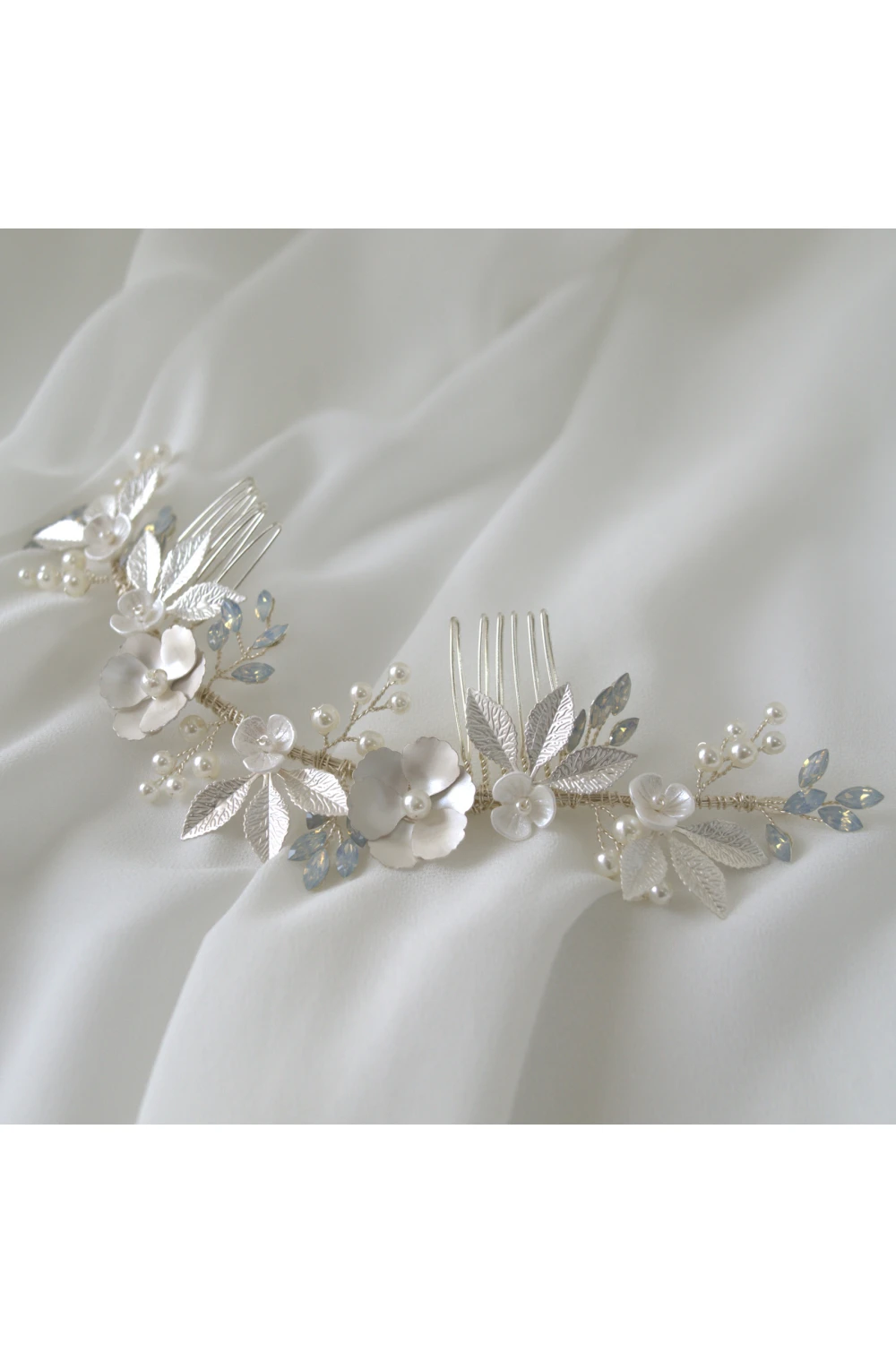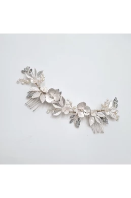 Luxusná kvetovaná svadobná ozdoba do vlasov s dvomi hrebienkami pre lepšie upevnenie do účesu. Precízna ručná výroba, ktorá vám vyrazí dych. Kvietky, lístkočky, perličky upevnené drôtikmi o kovové hrebienky. Strieborná farba.