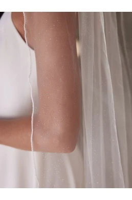 Tento úžasný svadobný závoj je luxusným doplnkom, ktorý dodá vášmu svadobnému vzhľadu výnimočný lesk. Model S-521 je vyrobený z jemného trblietavého tylu a má elegantný jednovrstvový dizajn s dĺžkou 300 cm, čo z neho robí pôsobivý prvok svadobného outfitu. Okraje závoja sú zdobené jemnými sklenenými korálkami, ktoré mu dodávajú sofistikovaný a žiarivý charakter. Súčasťou je aj pripevnený hrebeň, ktorý zaručuje pohodlné a bezpečné nosenie.